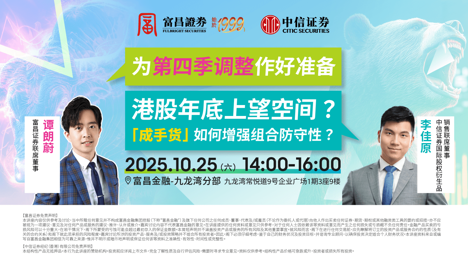本讲座内容仅供参考及讨论,当中所载任何意见并不构成富昌金融集团控股(下称“富昌金融”)及旗下任何公司之任何成员、董事、代表及/或僱员(不论作为委託人或代理)向他人作出买卖任何证券、期货、期权或其他融资类工具的要约或招揽,亦不应被视为一项建议、意见及对任何产品或服务的建议、推许、认许或推介。嘉宾讨论内容不代表富昌金融的意见。在讲座提供的任何资料或意见只供参考,对于任何人士因依赖该等资料或意见而产生之任何损失或亏损概不负任何责任。金融产品买卖的亏损风险可以十分重大,在若干情况下,阁下所蒙受的亏蚀可能会超过最初存入的保证金数额。本简短声明并不涵盖投资产品或服务的所有风险及其他重要事宜。就风险而言,阁下在进行任何交易前,应先瞭解将订立的投资产品或服务合约的性质(及有关的合约关係)和阁下就此须承担的风险程度。嘉宾讨论所涉的投资产品、服务及/或投资策略并不适合所有投资者。因此,阁下必须仔细考虑,鑑于自己的财务状况及投资目标,并谘询专业顾问,以确保投资决定适合个人财务状况。本讲座资料来自或编写自富昌金融集团相信为可靠之来源,惟并不明示或暗示地声明或保证任何该等资料之准确性、有效性、时间性或完整性。