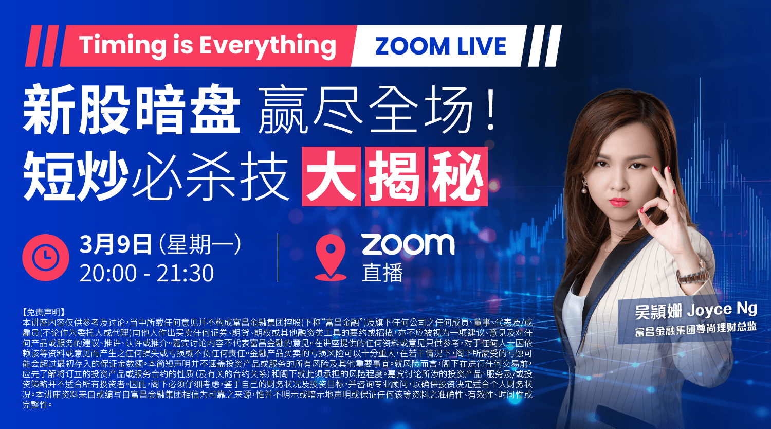 本讲座内容仅供参考及讨论,当中所载任何意见并不构成富昌金融集团控股(下称“富昌金融”)及旗下任何公司之任何成员、董事、代表及/或僱员(不论作为委託人或代理)向他人作出买卖任何证券、期货、期权或其他融资类工具的要约或招揽,亦不应被视为一项建议、意见及对任何产品或服务的建议、推许、认许或推介。嘉宾讨论内容不代表富昌金融的意见。在讲座提供的任何资料或意见只供参考,对于任何人士因依赖该等资料或意见而产生之任何损失或亏损概不负任何责任。金融产品买卖的亏损风险可以十分重大,在若干情况下,阁下所蒙受的亏蚀可能会超过最初存入的保证金数额。本简短声明并不涵盖投资产品或服务的所有风险及其他重要事宜。就风险而言,阁下在进行任何交易前,应先瞭解将订立的投资产品或服务合约的性质(及有关的合约关係)和阁下就此须承担的风险程度。嘉宾讨论所涉的投资产品、服务及/或投资策略并不适合所有投资者。因此,阁下必须仔细考虑,鑑于自己的财务状况及投资目标,并谘询专业顾问,以确保投资决定适合个人财务状况。本讲座资料来自或编写自富昌金融集团相信为可靠之来源,惟并不明示或暗示地声明或保证任何该等资料之准确性、有效性、时间性或完整性。