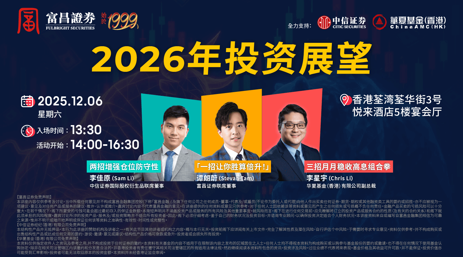 本讲座内容仅供参考及讨论,当中所载任何意见并不构成富昌金融集团控股(下称“富昌金融”)及旗下任何公司之任何成员、董事、代表及/或僱员(不论作为委託人或代理)向他人作出买卖任何证券、期货、期权或其他融资类工具的要约或招揽,亦不应被视为一项建议、意见及对任何产品或服务的建议、推许、认许或推介。嘉宾讨论内容不代表富昌金融的意见。在讲座提供的任何资料或意见只供参考,对于任何人士因依赖该等资料或意见而产生之任何损失或亏损概不负任何责任。金融产品买卖的亏损风险可以十分重大,在若干情况下,阁下所蒙受的亏蚀可能会超过最初存入的保证金数额。本简短声明并不涵盖投资产品或服务的所有风险及其他重要事宜。就风险而言,阁下在进行任何交易前,应先瞭解将订立的投资产品或服务合约的性质(及有关的合约关係)和阁下就此须承担的风险程度。嘉宾讨论所涉的投资产品、服务及/或投资策略并不适合所有投资者。因此,阁下必须仔细考虑,鑑于自己的财务状况及投资目标,并谘询专业顾问,以确保投资决定适合个人财务状况。本讲座资料来自或编写自富昌金融集团相信为可靠之来源,惟并不明示或暗示地声明或保证任何该等资料之准确性、有效性、时间性或完整性。