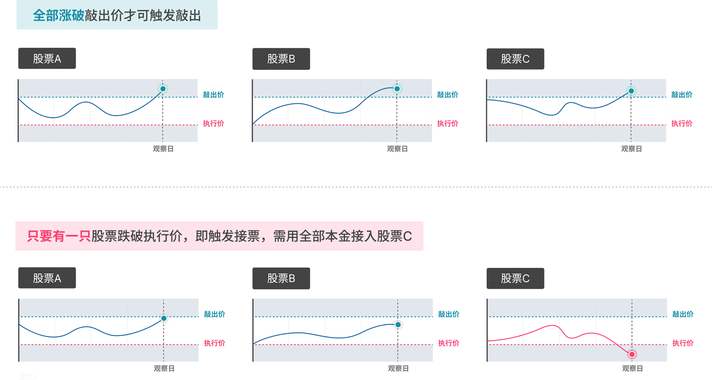 那么如何判定FCN挂钩多只股票时的敲出或接票呢?一般有两种方式: