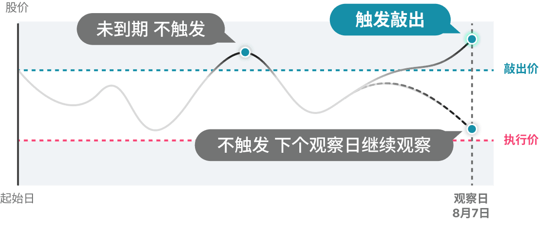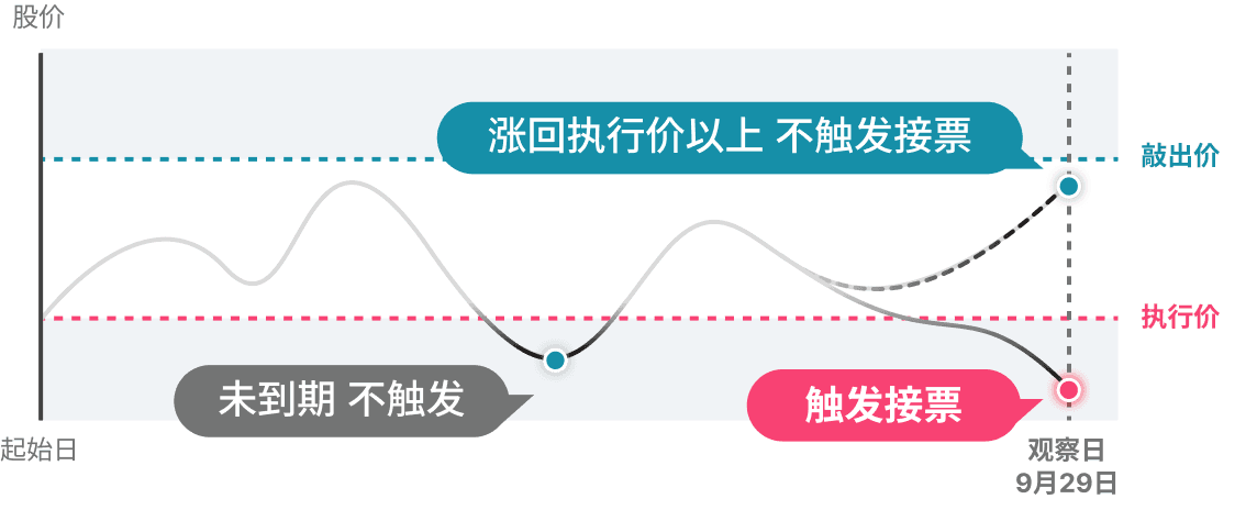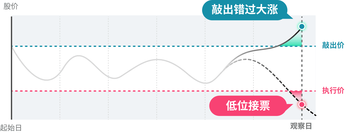 但因为每月/期末观察的时间段较长,也可能出现「涨破」时间点落于观察日,导致错过股票大涨,或遭遇股价大跌低位接票的风险。
