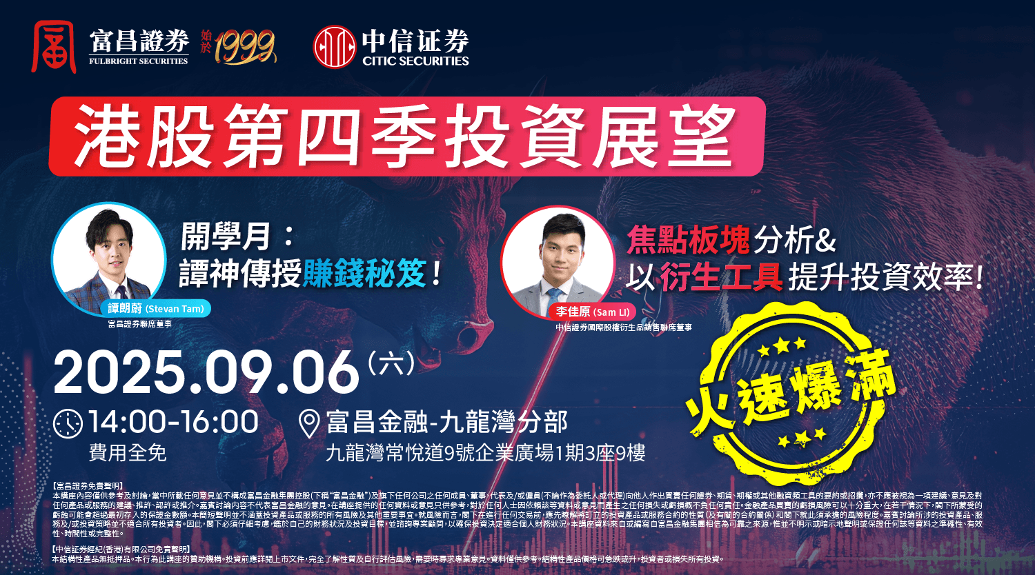 本講座內容僅供參考及討論,當中所載任何意見並不構成富昌金融集團控股(下稱“富昌金融”)及旗下任何公司之任何成員、董事、代表及/或僱員(不論作為委託人或代理)向他人作出買賣任何證券、期貨、期權或其他融資類工具的要約或招攬,亦不應被視為一項建議、意見及對任何產品或服務的建議、推許、認許或推介。嘉賓討論內容不代表富昌金融的意見。在講座提供的任何資料或意見只供參考,對於任何人士因依賴該等資料或意見而產生之任何損失或虧損概不負任何責任。金融產品買賣的虧損風險可以十分重大,在若干情況下,閣下所蒙受的虧蝕可能會超過最初存入的保證金數額。本簡短聲明並不涵蓋投資產品或服務的所有風險及其他重要事宜。就風險而言,閣下在進行任何交易前,應先瞭解將訂立的投資產品或服務合約的性質(及有關的合約關係)和閣下就此須承擔的風險程度。嘉賓討論所涉的投資產品、服務及/或投資策略並不適合所有投資者。因此,閣下必須仔細考慮,鑑於自己的財務狀況及投資目標,並諮詢專業顧問,以確保投資決定適合個人財務狀況。本講座資料來自或編寫自富昌金融集團相信為可靠之來源,惟並不明示或暗示地聲明或保證任何該等資料之準確性、有效性、時間性或完整性。