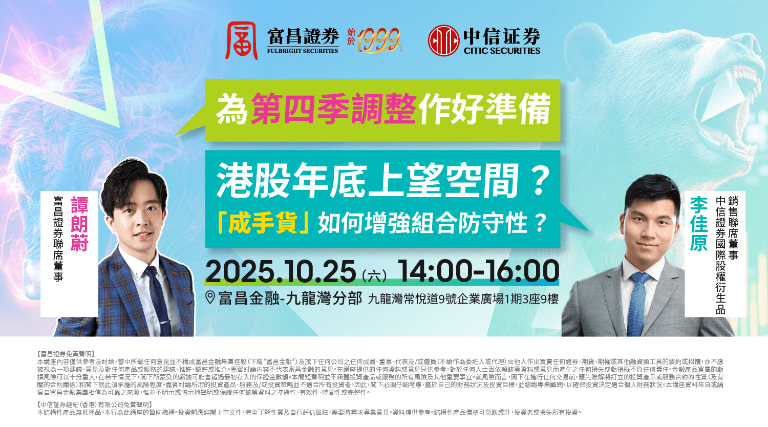 本講座內容僅供參考及討論,當中所載任何意見並不構成富昌金融集團控股(下稱“富昌金融”)及旗下任何公司之任何成員、董事、代表及/或僱員(不論作為委託人或代理)向他人作出買賣任何證券、期貨、期權或其他融資類工具的要約或招攬,亦不應被視為一項建議、意見及對任何產品或服務的建議、推許、認許或推介。嘉賓討論內容不代表富昌金融的意見。在講座提供的任何資料或意見只供參考,對於任何人士因依賴該等資料或意見而產生之任何損失或虧損概不負任何責任。金融產品買賣的虧損風險可以十分重大,在若干情況下,閣下所蒙受的虧蝕可能會超過最初存入的保證金數額。本簡短聲明並不涵蓋投資產品或服務的所有風險及其他重要事宜。就風險而言,閣下在進行任何交易前,應先瞭解將訂立的投資產品或服務合約的性質(及有關的合約關係)和閣下就此須承擔的風險程度。嘉賓討論所涉的投資產品、服務及/或投資策略並不適合所有投資者。因此,閣下必須仔細考慮,鑑於自己的財務狀況及投資目標,並諮詢專業顧問,以確保投資決定適合個人財務狀況。本講座資料來自或編寫自富昌金融集團相信為可靠之來源,惟並不明示或暗示地聲明或保證任何該等資料之準確性、有效性、時間性或完整性。