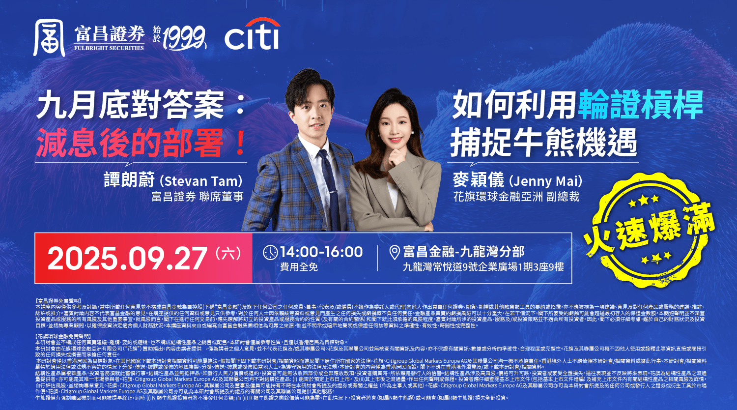 本研討會由花旗環球金融亞洲有限公司(“花旗”)贊助播出。內容由講者提供 ,僅為講者之個人意見,並不代表花旗及/或其聯屬公司。花旗及其聯屬公司並無核查有關資訊及內容,亦不保證有關資訊、數據或分析的準確性、合理程度或完整性。花旗及其聯屬公司概不因他人使用或詮釋此等資訊直接或間接引致的任何損失或損害而承擔任何責任。